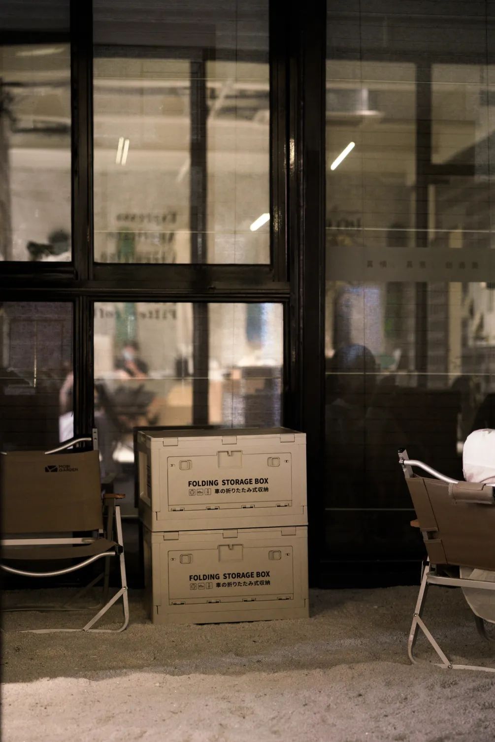 天幕被搭在门前的草坪上,店铺一边支开的椅子也是户外椅,聊天时@xx 拿来喝水的杯子也成了可折叠杯耳的轻量钛杯。