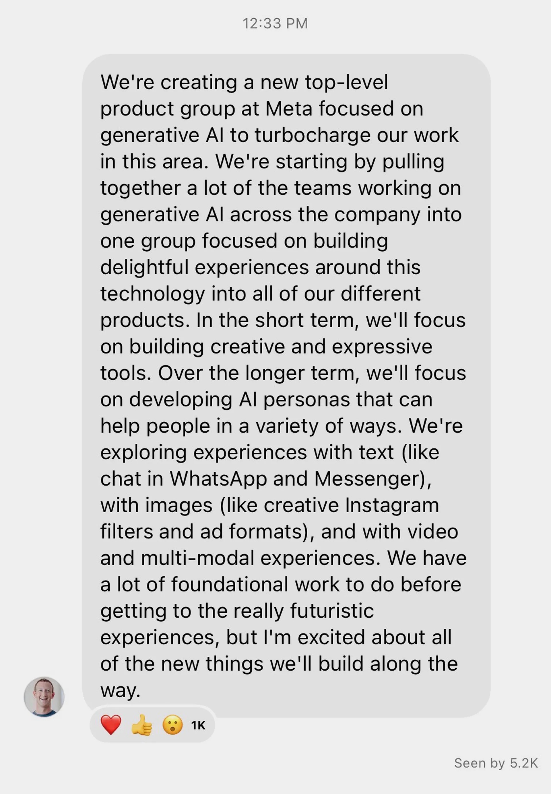 扎克伯格写道:“我们正在Meta创建一个新的顶级产品组,专注于生成人工智能,以推动我们在这一领域的工作。” “在获得真正的未来体验之前,我们还有很多基础工作要做,但我对我们将在此过程中打造的所有新事物感到兴奋。”