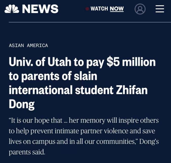 据美国媒体报道,犹他大学(University of Utah)本周宣布,将向2022年在该校遇害的一名中国留学生的父母支付500万美元和解金。