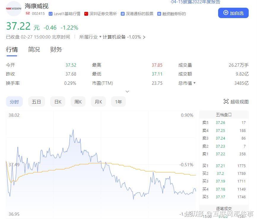 截至2023年2月27日收盘,海康威视报37.22元/股,跌1.22%,总市值3485亿,较之于其巅峰时的5767亿市值,蒸发逾2200亿!