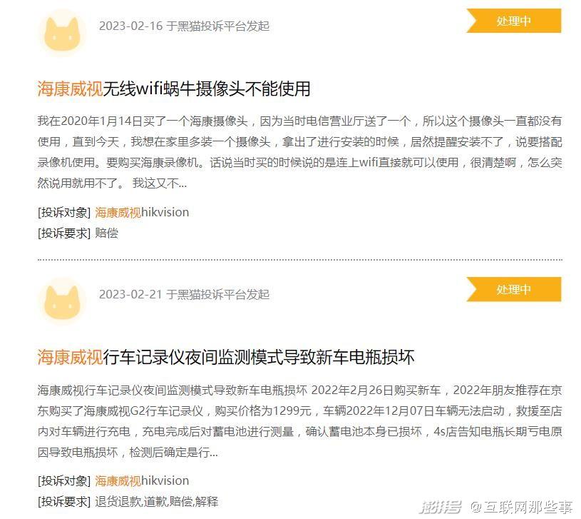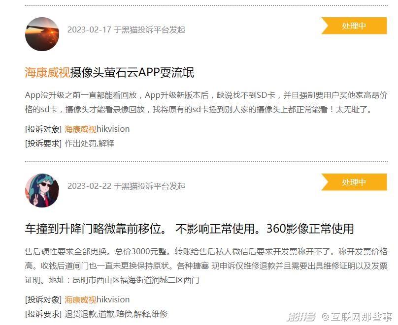 目前这些投诉均显示在处理中,尚未见有处理完毕的,产品是企业最好的名片,也希望海康威视能真正重视起来,包括但不限于努力提升售后服务体验,提升产品质栓标准等,只有产品质量过硬,用户才不会源源不断流失!
