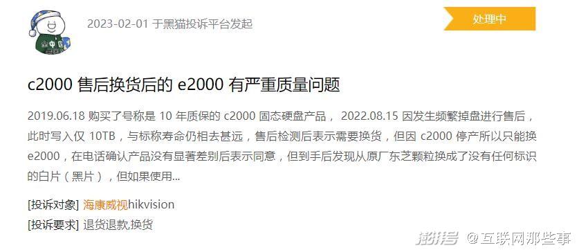 网友投诉的产品涉及到海康威视摄像头萤石云App、海康威视行车记录仪致新车电瓶损坏、号称十年质保的c2000固态硬盘和迭代产品e2000均有严重问题等。