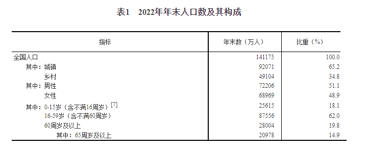 年末全国人口141175万人,比上年末减少85万人,其中城镇常住人口92071万人。全年出生人口956万人,出生率为6.77‰;死亡人口1041万人,死亡率为7.37‰;自然增长率为-0.60‰。