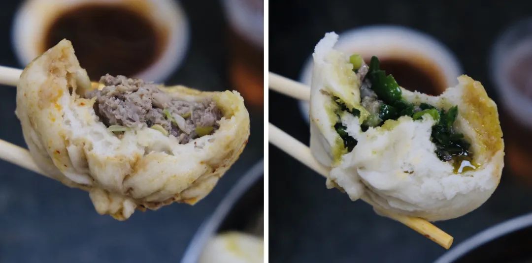 牛肉胡萝卜馅是清真包子的经典馅料。牛肉自带的油脂被胡萝卜丝充分吸收,混合着厚重的花椒味,是意想不到的美味。人气最高的牛肉韭菜包子,因为韭菜的吸油能力有限,能看到饱满的汤汁,闪烁着脂肪原始的耀人光芒。