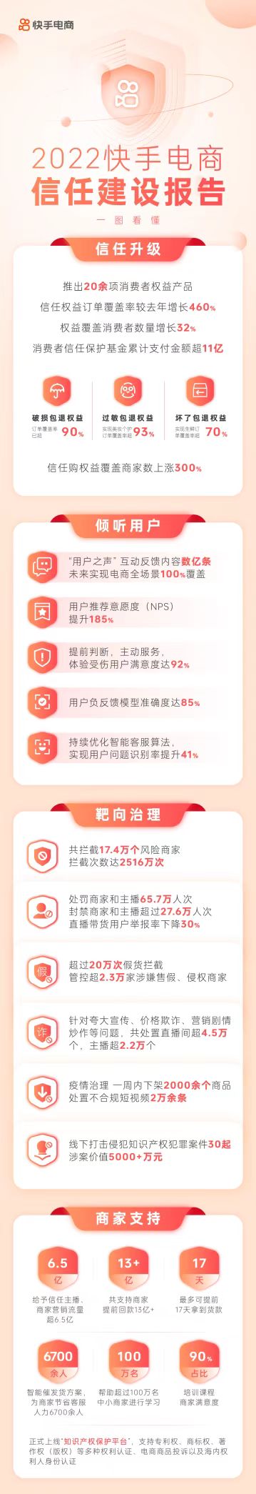 无论是在传统商业还是新型电商形态中,“信任”都是必不可少的要素。近日,快手电商发布《2022快手电商信任建设报告》(以下称“报告”),从用户倾听、用户权益保障、履约能力、平台治理、商家支持五大方面,系统总结其在2022年的信任生态建设情况,持续构建信任电商环境。