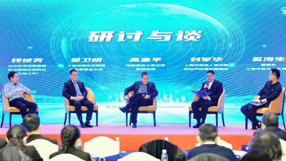 第三阶段由华东政法大学法律学院教授高富平主持,上海高院知产庭庭长刘军华、上海市律协互联网业务委员会主任吴卫明、上海市长宁区市场监管局执法稽查科副科长钱斌芳、爱奇艺上海法务合规负责人奚海生就主旨发言及交流发言展开与谈。
