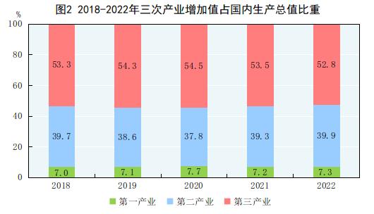 据《中华人民共和国2022年国民经济和社会发展统计公报》,初步核算,全年国内生产总值1210207亿元,比上年增长3.0%。其中,第一产业增加值88345亿元,比上年增长4.1%;第二产业增加值483164亿元,增长3.8%;第三产业增加值638698亿元,增长2.3%。第一产业增加值占国内生产总值比重为7.3%,第二产业增加值比重为39.9%,第三产业增加值比重为52.8%。