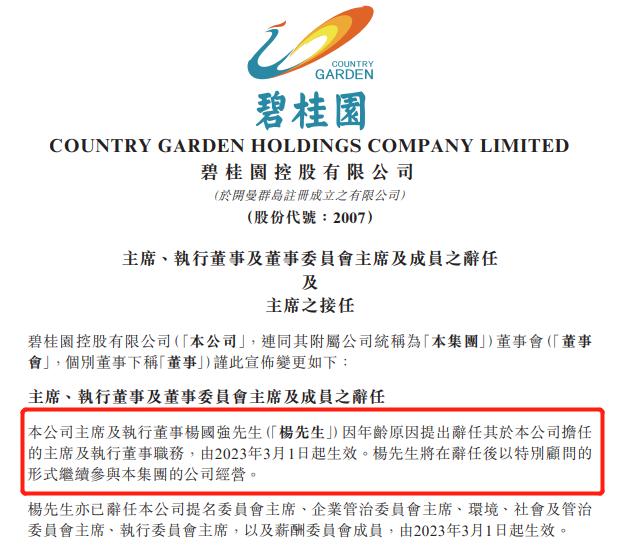 该公司董事会主席及执行董事杨国强因年龄原因辞任,由其女儿、联席主席杨惠妍接任。