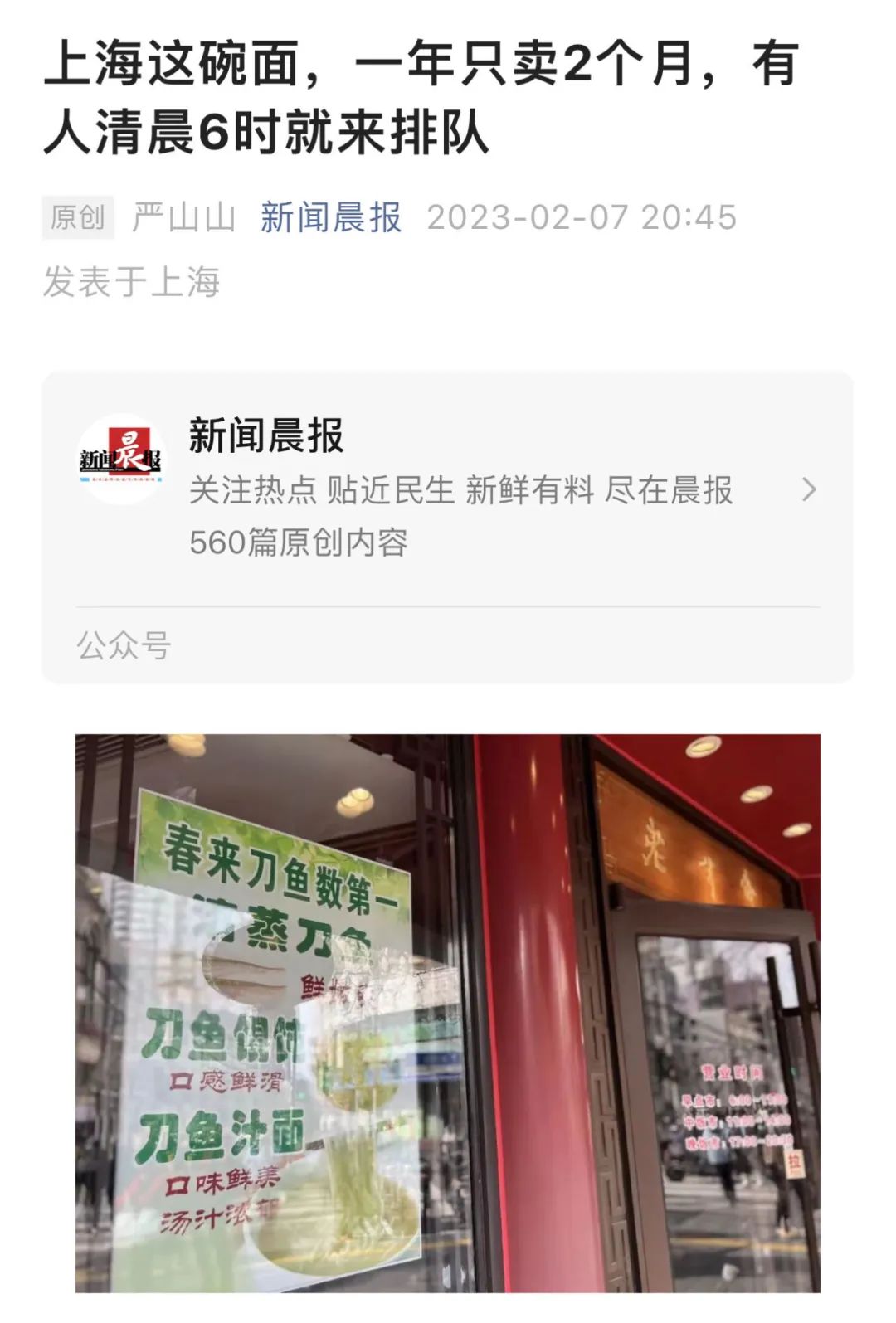 “刀鱼面”,如果严谨一些,应该叫“刀鱼汁面”,因为其中没有鱼肉,只是刀鱼熬出的汤汁。那汤汁经过多道工序,用料颇多,浓郁稠厚,色白似乳,虽然不见鱼,但“长江第一鲜”的咸鲜味道已经融入面中了。说到这个“江”,似乎也必须加注一笔。长江刀鱼,直到20世纪90年代,年产量也有千余吨。但至2019年“禁捕令”颁布前夕,年产量已不足百吨。也就是那一年,老半斋把“长江刀鱼”的宣传海报摘了下来,其后的刀鱼汁面还在,只是把“江刀”换成“海刀”,本文的话题就由此展开。