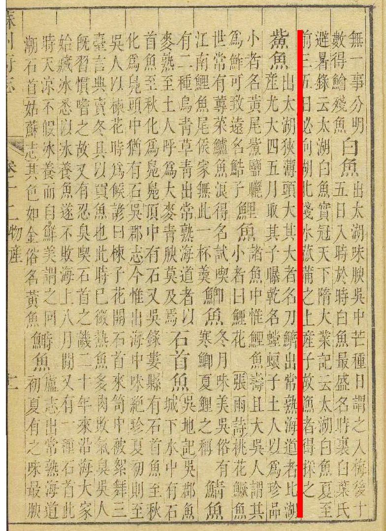 中国历代文献典籍中较早出现的关于刀鱼的记载就涉及太湖。《山海经·南山经》记载:浮玉之山,北望具区(郭璞注:具区今吴县西南太湖也,尚书谓之震泽),东望诸毗……苕水出于其阴,北流注于具区,其中多鮆鱼(郭璞注:鮆鱼,狭薄而长头,大者尺余,太湖中今饶之,一名刀鱼,音祚启反)。这里出现了一个生僻词“鮆”(cǐ或jì) ,东汉班固所著《汉书·货殖传》在记述城镇经济活动的内容中也提及:“通邑大都酤一岁千酿,醯酱千瓨,筋角丹沙千斤,其帛絮细布千钧,文采千匹,……鲐鮆千斤(师古曰:鲐,海鱼也。鮆,刀鱼也,饮而不食者。鲐音胎,又音菭。鮆音荠,又音才尔反。)”
