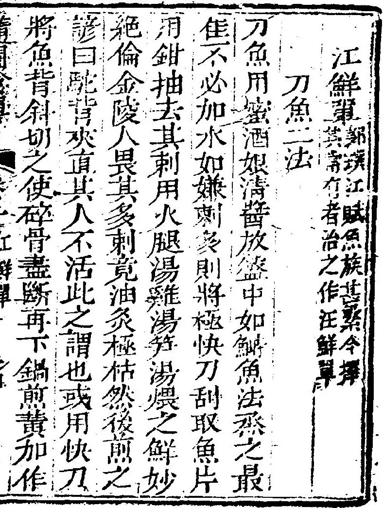 《大明会典》(哈佛大学藏版)所记江阴县上供朝廷鲚鱼事项诗词寄情,但谈到刀鱼味美,当数清代美食家的实践性研究最为透彻。李渔曾言道,食鲥鲟易腻,但刀鱼“则愈甘,至果腹而不释手”。“清明挂刀,端午品鲥。”刀鱼,清人称其为“春馔第一鲜品”,在长江诸鲜中,最先吃到的便是刀鱼。在烹饪方面上,也是费尽心思。集清代中期厨师经验之大成的《调鼎集》中,便载有刀鱼圆、炸刀鱼、炙刀鱼、刀鱼汤、刀鱼豆腐等十多种。