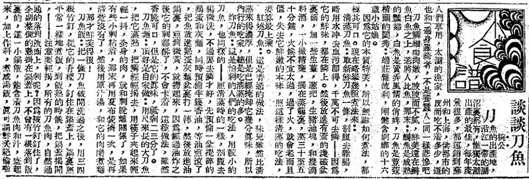近代以来,繁荣的餐饮业也使得刀鱼(以江刀为主)成为在上海非常吃香的时鲜货。百余年前的上海报刊中也有许多相关报道。如这篇《申报》1935年2月15日刊发的“谈谈刀鱼”,其中就提到太湖出产的刀鱼口味颇佳,还列举了“红色刀鱼”“清蒸刀鱼”“炸刀鱼”“刀鱼饭”“刀鱼面”等烹饪方法。
