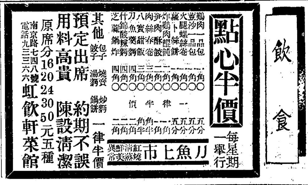 《申报》1937年2月17日刊发“新半斋”菜馆广告,菜品中就有刀鱼面和红烧刀鱼。该店位于汉口路浙江路口,据传曾是“老半斋”的主要竞争对手