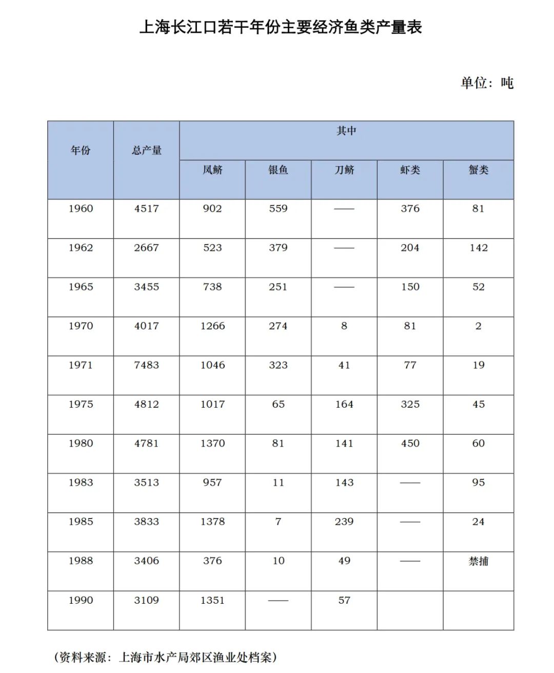 1973—1975年,农林部下达“长江水产资源调查”任务,上海市水产研究所、江苏省水产科学研究所、安徽省农林局水产站等机构会同南京大学生物学等参与其中,并在1976年形成《长江流域刀鲚资源调查报告》,其中有大量详尽的数据和表格,图为各地渔汛期和旺汛期数据表,可见当时的刀鱼资源是非常丰富的江刀名声远播,且有时限,因此“明前品刀鲚”已成为一种极具仪式感的美食符号。苏浙沪地区的商贩以“天下第一鲜”的噱头将其价格越炒越高,“以吃为荣”的饕餮客不惜重金也要一尝为快,由此驱使,价格必然疯涨,过度炒作势必导致过度捕捞。每年清明节前刀鱼价格可翻10倍,在南京、杭州等地可卖到5000元~8000元/斤,上海更是有每斤万元的天价,这种畸形的定价已远超一些奢侈品。在利益的驱使下,渔民们开始大量捕捞,导致本就数量不多的长江刀鱼越发稀缺。