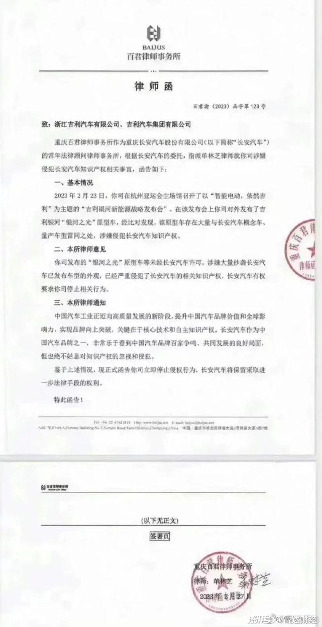 2月28日,一份长安汽车委托律师事务所发给吉利汽车的律师函流传在网络中。
