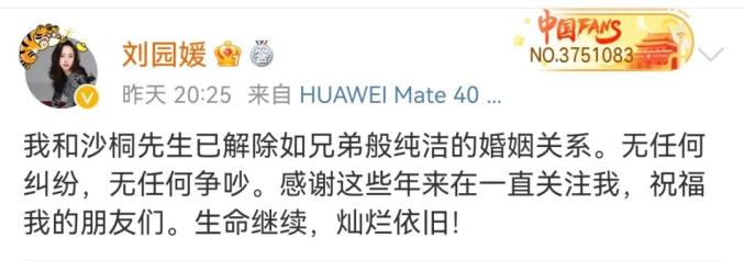 2月28日,演员刘园媛在社交平台发文,宣布与央视主持人沙桐离婚,配文称:“我和沙桐先生已解除如兄弟般纯洁的婚姻关系。无任何纠纷,无任何争吵。感谢这些年来在一直关注我、祝福我的朋友们。生命继续,灿烂依旧!”