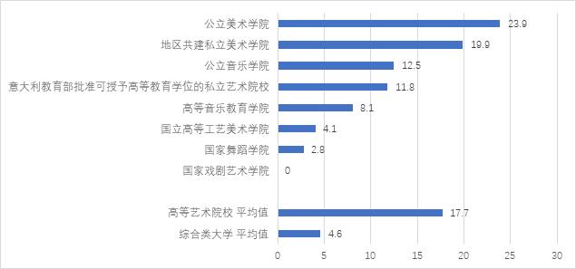 如前所述,纳入AFAM体系的院校共155所,且专业划分明细。从数量上来讲已远超意大利的综合性大学数量。由于专业教学的独特性,大部分院校办学规模较小。与综合性大学相比,学生和教师数量少,一些“冷门“专业的注册学生数量更少。平均每所院校的注册学生数490多人,教师人数与学生人数之比约为1:5(笔者根据2018/2019学年意大利大学科研部的统计数据计算)。另外,意大利艺术院校的设置也与当地的文化创意产业发展关系密切,如法恩莎高等工艺美术学院的建立是为满足当地陶瓷工业发展的需求而建立的以陶瓷设计见长的工艺美术学院。位于世界著名的大理石产区的卡拉拉美术学院最为擅长的优势专业是大理石雕塑专业以及石材质的文物和艺术品的修复。而在意大利中北部拥有众多典型的“意大利制造“如服装、时尚,家具与家居产业、珠宝、乐器等产业集群,因此这些地区以设计/时尚专业为主的私立艺术院校数量较多。