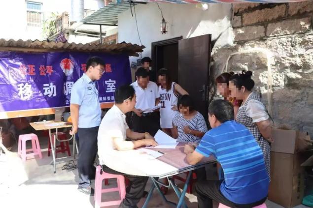 ↑华安县仙都镇“对比算账+信访评理”现场一张办公桌、一部手提电脑、一台打印机,再加上当事人与调解员,设施虽少但一应俱全,这就是云霄县下河司法所的“移动调解室”。每当发生需要调解的矛盾时,在村庄巷口、田间地头,人们就会看见这样一个场面——调解员们变“坐堂办公”为“上门调解”,让矛盾纠纷化解在百姓“家门口”。