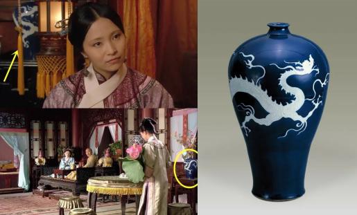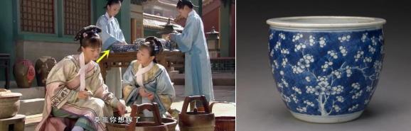 背景中的瓷盆纹饰是冰梅纹,正是康熙时期所创,晚清民国的器物上也经常出现,与剧中时期(雍正早期)符合。