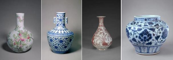 还有很多其他陶瓷瓶,像粉彩蟠桃纹天球瓶、缠枝莲纹贯耳瓶、釉里红松竹梅纹玉壶春瓶、景德镇窑青花缠枝牡丹纹罐、青花双耳葫芦式扁瓶......