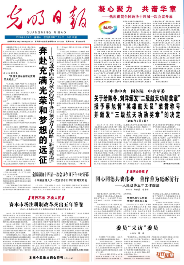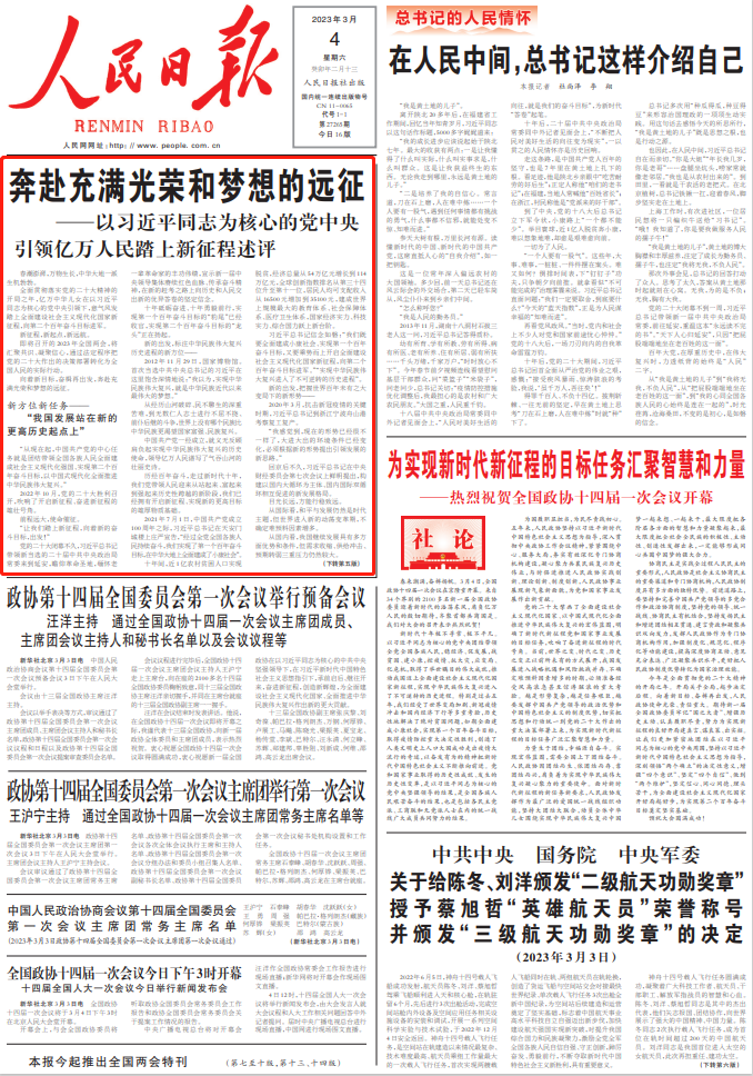 3月4日出版的《人民日报》、《新华每日电讯》、《解放军报》、《光明日报》、《经济日报》、《中国纪检监察报》、《工人日报》、《中国青年报》、《农民日报》、《法治日报》等媒体,均在头版头条位置刊发《奔赴充满光荣和梦想的远征——以习近平同志为核心的党中央引领亿万人民踏上新征程述评》文章。