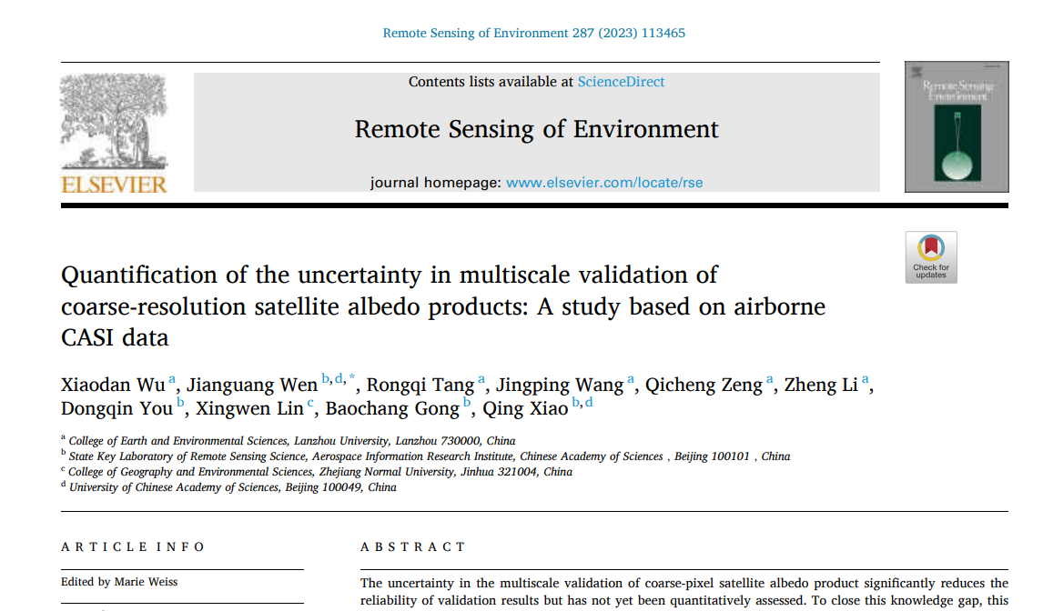 近日,兰州大学资源环境学院吴小丹教授团队在遥感领域期刊《环境遥感》(RemoteSensingofEnvironment)上发表了题为“粗分辨率遥感产品多尺度验证中不确定性的量化-基于机载CASI数据”(Quantiffcation of the uncertainty in multiscale validation of coarse-resolution satellite albedo products: A study based on airborne CASI data)的最新研究成果,回答了定量遥感真实性检验工作中的作为衡量遥感产品准确不准确的参考真值到底真不真的问题,给出了量化像元尺度参考真值及最终验证结果不确定性的方法,明确了引起真实性检验结果不确定性的主要因素,阐明了真实性检验过程中各主要环节的不确定性之间的传递机制。该研究结果有利于建立不确定性最小的像元尺度参考真值数据集,进而得到更可靠的真实性检验结果。