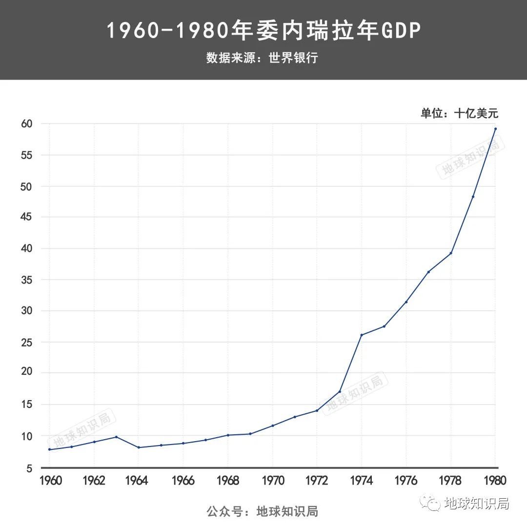 事实上也正是如此,历史上几次油价大涨的周期中,委内瑞拉都赚的盆满钵满。即使在1952-1958年的军人独裁、政局动荡时期,得益于高油价,委内瑞拉每年的GDP依然保持上涨。此时其生活水平比欧洲的多数国家都好,其人均GDP甚至位居世界第四。