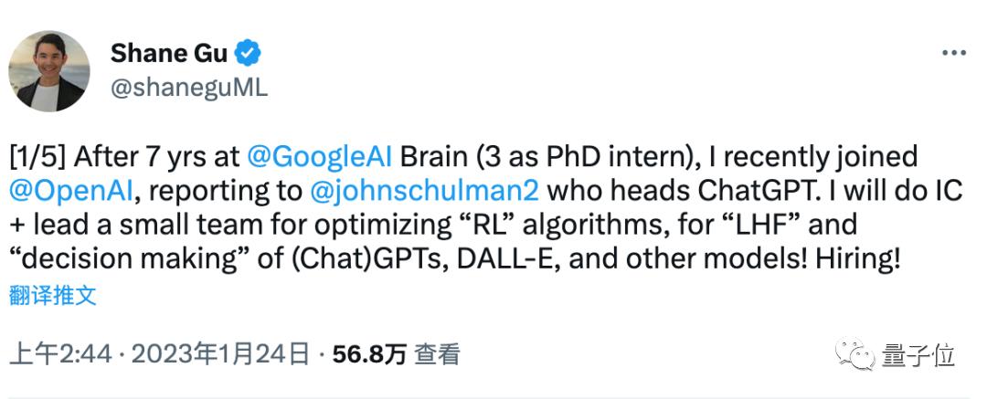 人才大战里的华人面孔今年年初,大模型人才的跳槽愈发频繁。从谷歌加入OpenAI的谷歌大脑4人之一中,包括华人顾世翔(Shane Gu),谷歌大脑日本团队前成员,剑桥大学博士,本科在多伦多大学师从三巨头之一Hinton。去年5月,只要加上一句“让我们一步一步地思考”就能让GPT-3做数学题的准确率暴涨61%这事,就是顾世翔参与的研究发现。
