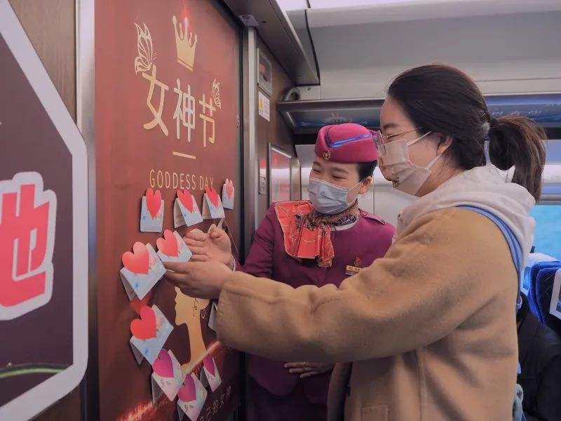 当天,列车工作人员纷纷为女性旅客们送去鲜花和祝福,同时,还在车厢里设置许愿墙,让旅客们留下美好的祝福以及心愿。
