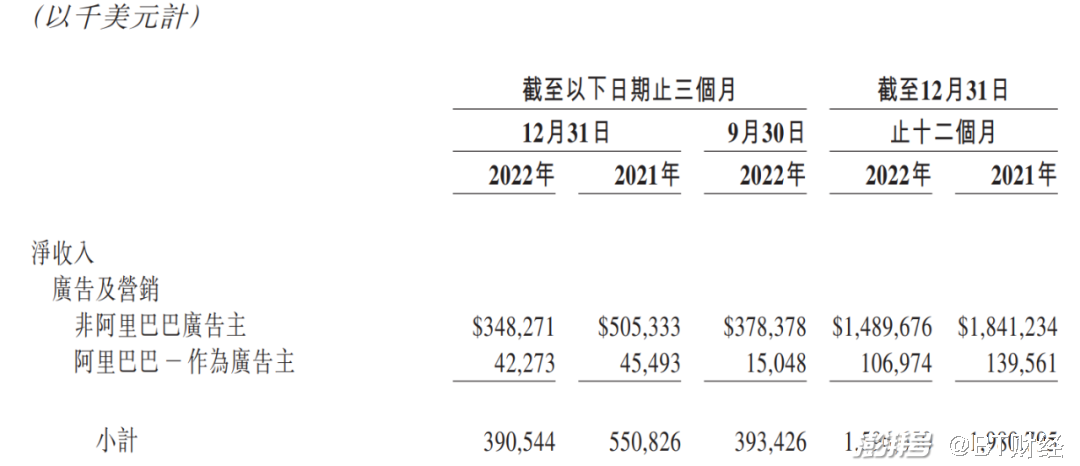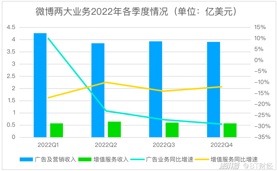 全年来看,2022年微博广告及营销收入为16.0亿美元,同比下降19%;增值服务收入为2.397亿美元,同比下降13%。