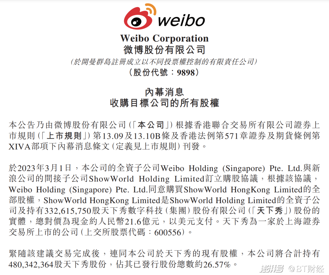 3月1日,微博发布公告称,公司斥资21.6亿元增持天下秀,交易完成后,总计持有后者26.57%的股权。