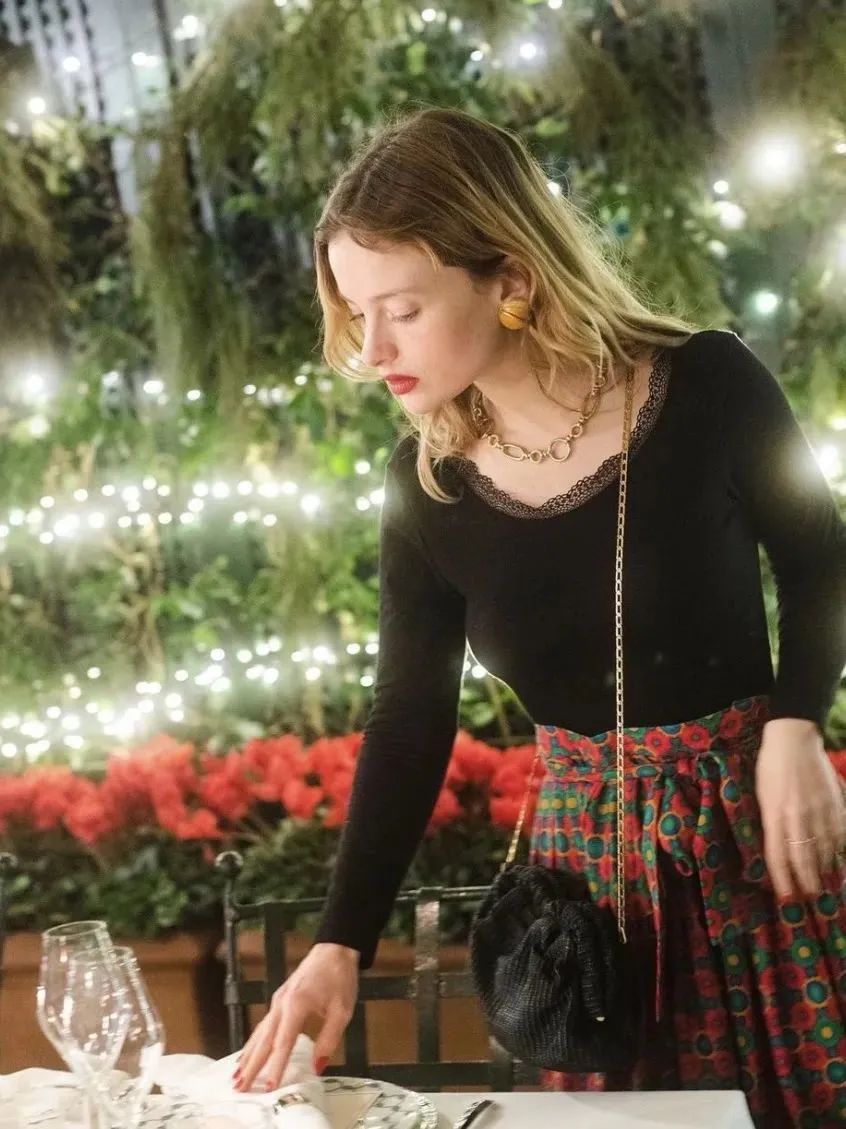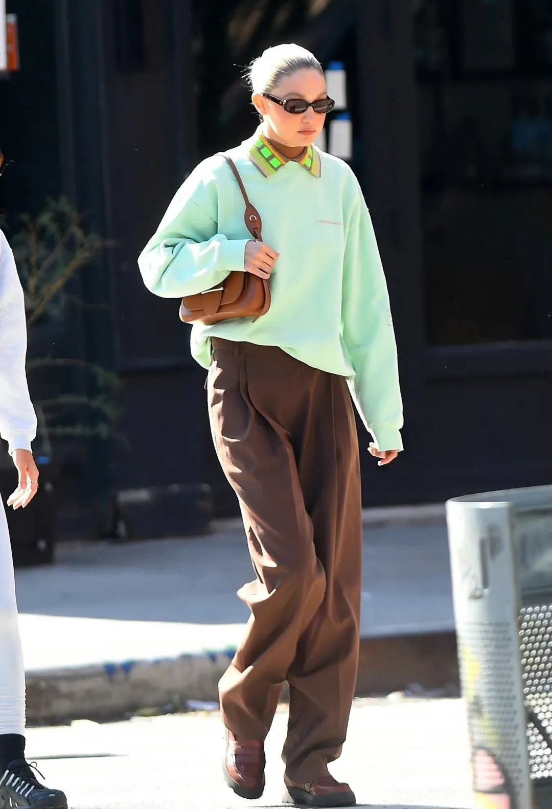 这样的搭配超级时髦,低领能在视觉上拉长脖子,也能起到瘦脸的效果。