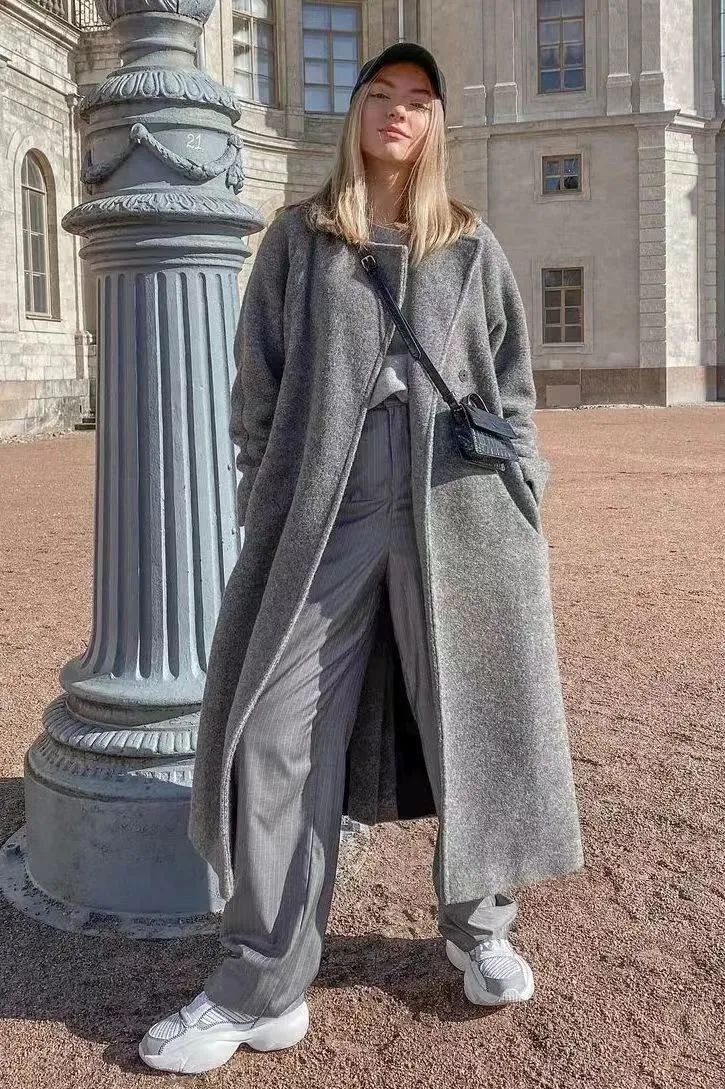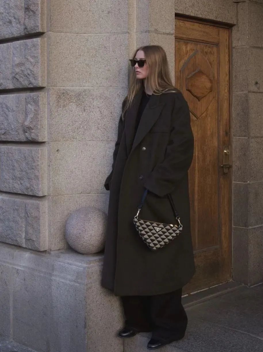推荐超省事的长款毛呢大衣,从肩膀到小腿的垂直线条,起到很好的显瘦效果。