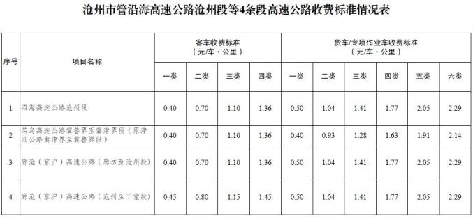 附件:沧州市管沿海高速公路沧州段等4条段高速公路车辆通行费标准