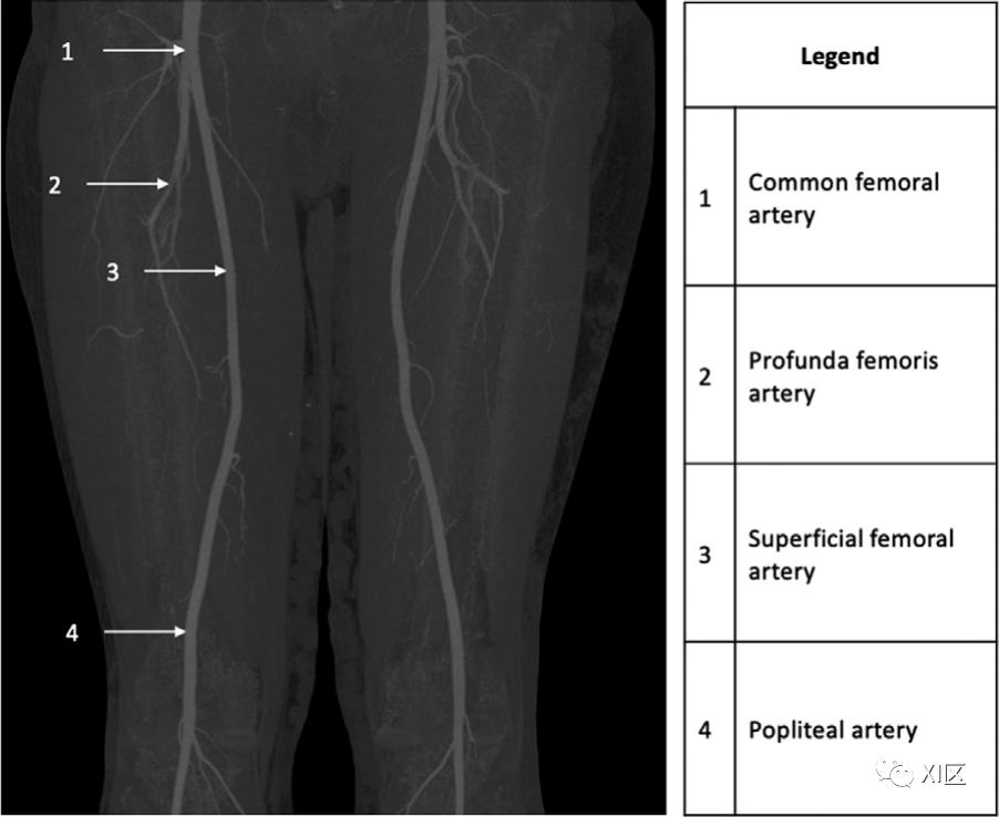 图1 35岁,解剖结构正常。冠状位上膝关节上方的最大密度投影CTA图像显示股总动脉(1)分叉成股浅动脉(3)和股深动脉(2)。股浅动脉与腘动脉相连(4)。当髂外动脉从腹股沟韧带下穿过,进入股三角区(大腿上部的解剖位置,以股四头肌、内收肌和腹股沟韧带为界),成为股总动脉(CFA)。定位CFA的血管标志是外侧髂周动脉和上腹下动脉。