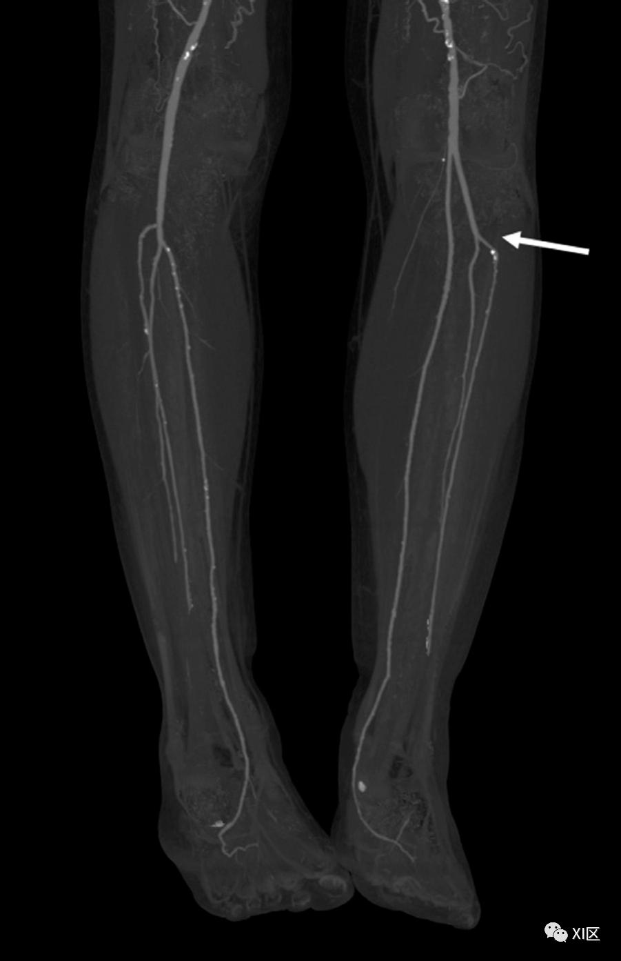 图4 冠状位最大密度投影CTA图像显示,65岁男子左腿胫前动脉和腓动脉源自同一起源(箭头)。足部的动脉供应高度可变。经典的足部血管解剖学是由两条循环通路组成,通过足弓连接。前循环由胫前动脉提供,因为它变成了足背动脉(直径为1.9-2.0mm),通过足底深支供应足弓。后循环由胫后动脉和腓动脉的分支组成,产生内侧和外侧足底动脉,以及小腿内侧动脉。足外侧动脉和足深动脉通常吻合形成足弓。足弓产生了跖动脉和足底指动脉,为脚趾提供血液供应。