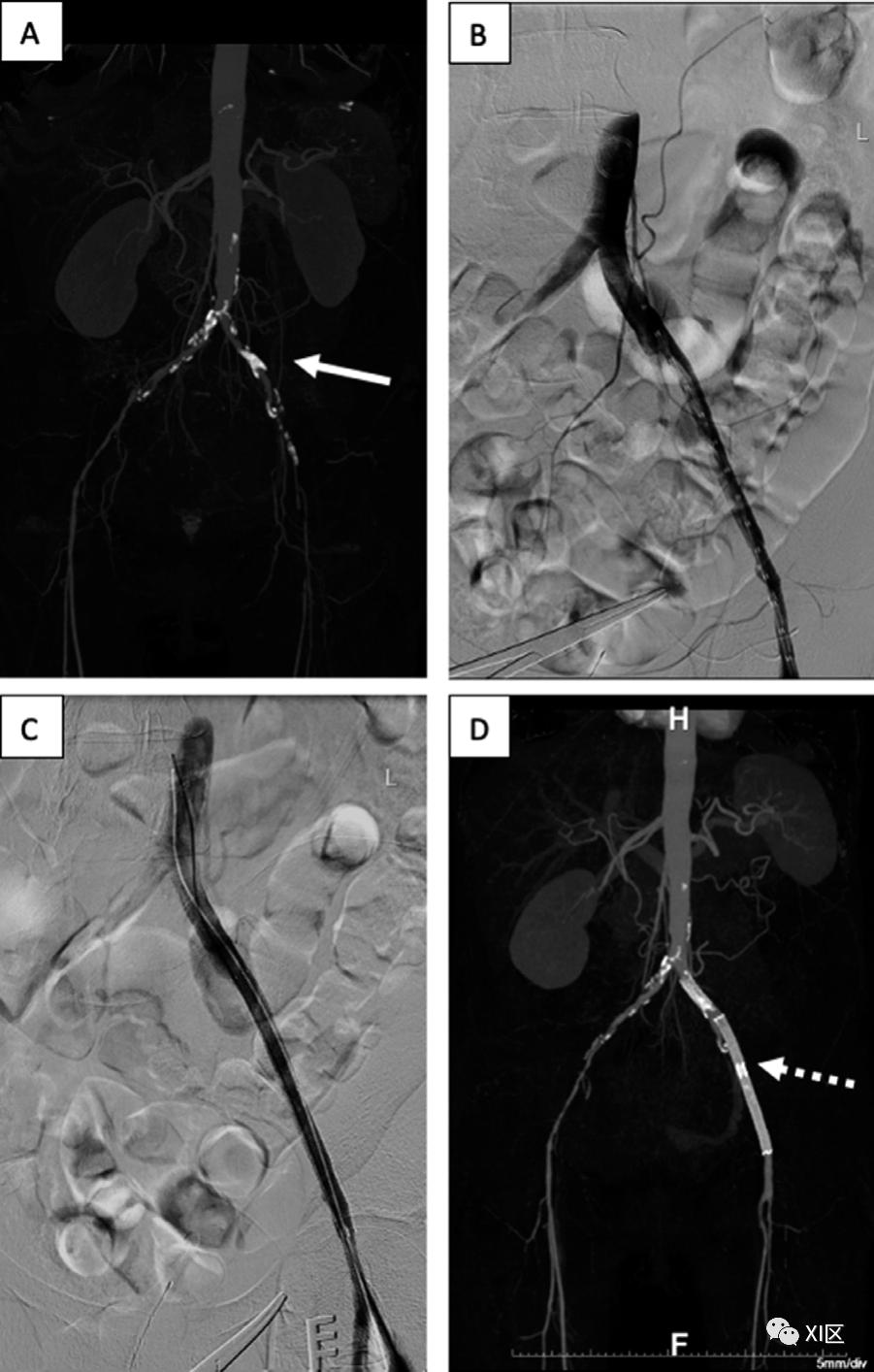 图6 59岁女性严重左腿缺血。A)冠状位上的最大密度投影CTA图像显示左髂外动脉钙化(箭头),导致严重严重狭窄/闭塞和流出减少。B)植入支架前的术中血管造影显示,通过左髂外动脉闭塞的血流减少。C)支架置入后的术中血管造影显示,与B相比,血流增加。D)冠状位上的最大密度投影CTA图像显示左侧髂外动脉支架(虚线箭头)和改善的血管流出。其他决定性的关键治疗细节包括CFA或PFA的参与、SFA闭塞的特征(弥漫性或局灶性,近端或远端),以及对作为外周旁路移植或膝下干预的潜在目标血管的跖动脉和足动脉的评估。特别是腘动脉的受累,由于其位置和流动性,使得该血管的治疗具有挑战性,因此在计划进行血管内或手术干预时需要仔细关注。根据病变的长度和狭窄程度,可以按照跨TASC标准进行分类,这是一个解剖学分类系统,为最佳血管再通策略(血管内与手术)的治疗决策提供指导(图7)。为了准确使用TASC标准,需要报告每个病变的特征,而不仅仅是最严重的病变。