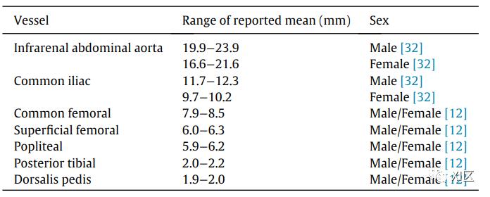 外围动脉瘤虽然不常见,但由于它们有可能形成血栓、导致栓子和破裂,因此令人担忧,而且必须报告。动脉瘤被定义为局部扩张超过原生血管直径的50%,并且涉及动脉壁的所有三层。表1中报告了下肢动脉的平均直径,在评估和报告动脉瘤时可以使用。值得注意的是,许多因素会影响动脉直径,包括年龄、性别和血压。