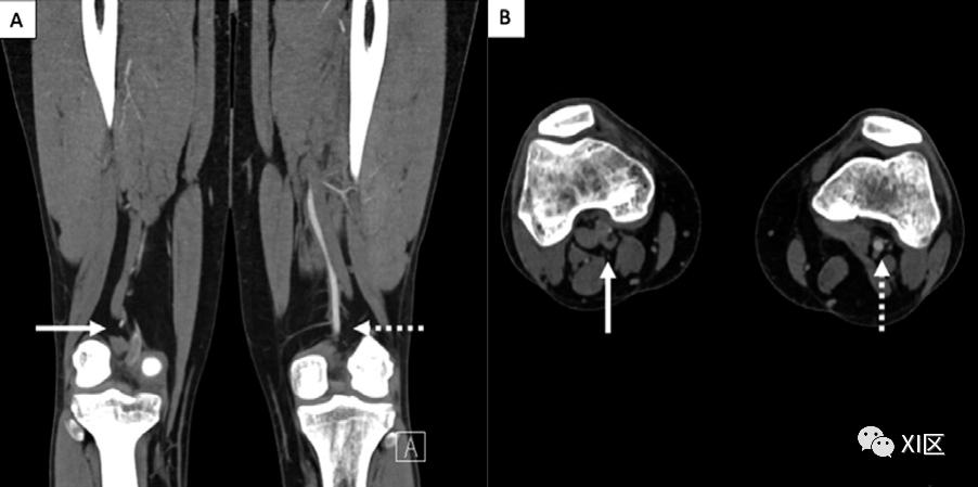 图9 34岁男性,单侧腘动脉卡压。冠状位(A)和轴位(B)的CTA图像显示,右腓肠肌内侧头压迫右腘动脉(箭头),左侧肢体的正常解剖关系(虚线箭头)。要确定腘动脉卡压的来源,需要进行成像。CTA可以描绘出动脉的变化,并提供高的软组织对比度,可以定义腘窝内的肌肉、血管、脂肪组织和骨骼。放射学报告中应包括的动脉变化是是否存在内侧偏移、狭窄、闭塞和动脉瘤形成,以及腘窝内是否存在突出的旁路。CTA对动脉狭窄的分级和周围肌肉异常的评估很有帮助,如肌肉插入点的变化。后期处理方法包括容积渲染和多平面重建,对于检测腘动脉移位的程度和造成动脉压迫的解剖学上的变异肌肉特别有用。临床医生需要一份关于动脉变化和周围解剖结构的详细报告,以确定最合适的手术方法。