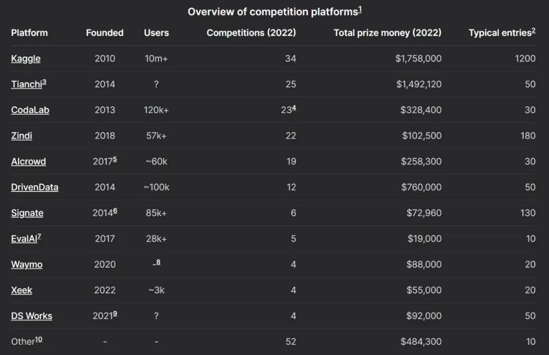 2022 年是 AI 领域发展的重要一年,在数据竞赛领域也同样如此,所有平台的总奖金超过了 500 万美元。