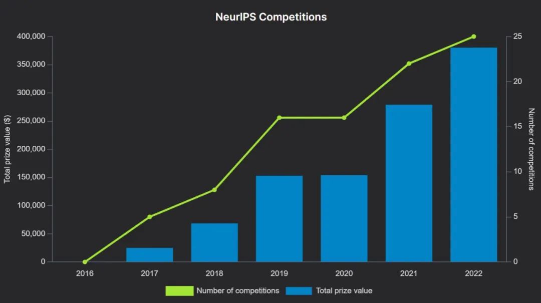 NeurIPS 在 2014 年首次在机器学习(CIML)研讨会方面举办了数据挑战赛,自 2017 年以来一直有竞赛环节。从那时起,竞赛和总奖金不断增长,在 2022 年 12 月达到了接近 40 万美元。其他机器学习会议也举办了比赛,包括 CVPR、ICPR、IJCAI、ICRA、ECCV、PCIC 和 AutoML。