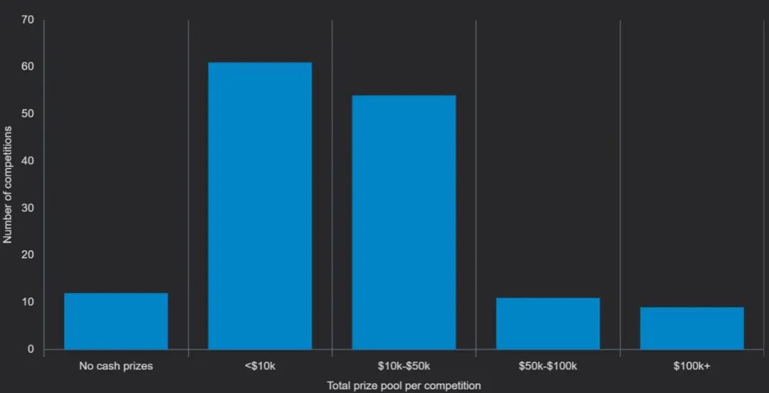大约一半的机器学习比赛有超过 1 万美元的奖池。毫无疑问,许多有趣的比赛奖金不多,本报告仅考虑那些有货币奖品或学术荣誉的部分。通常,与享有声望的学术会议相关的数据比赛为获奖者提供了旅行赠款,以便他们参加会议。