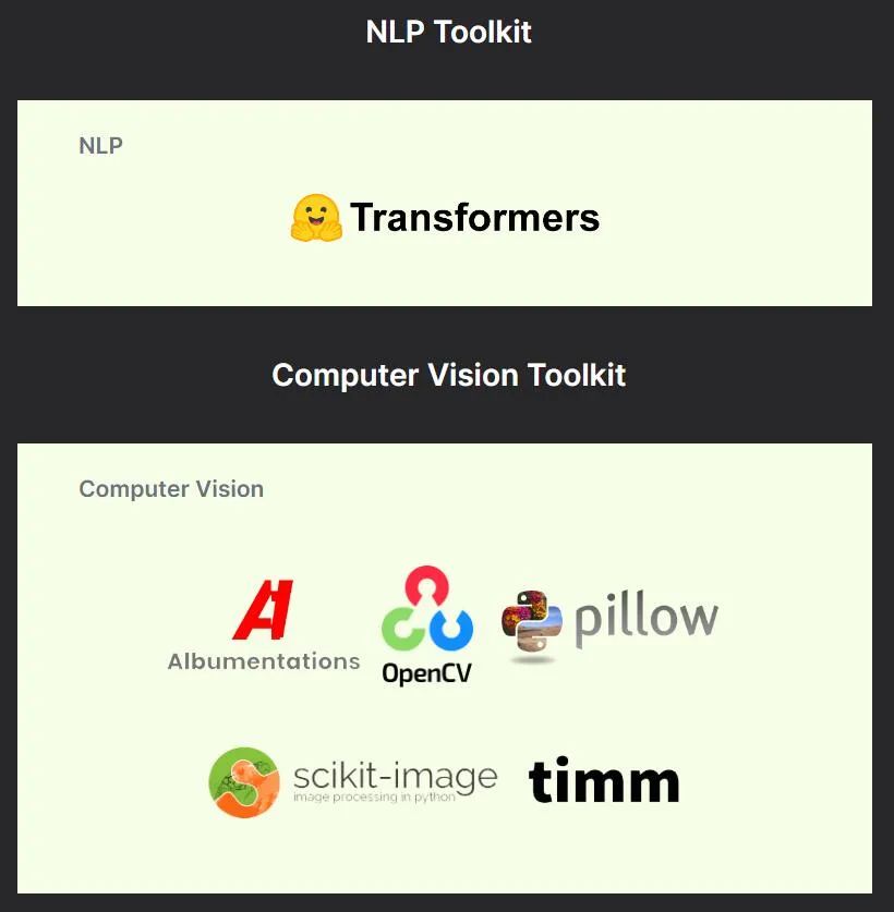 将最流行的软件包分为三类 —— 核心工具包、NLP 类和计算机视觉类。