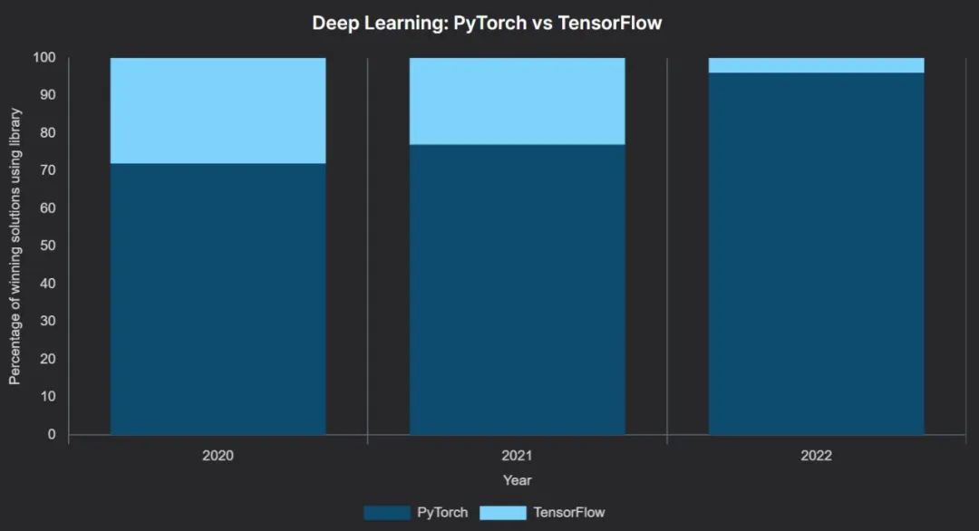 其中,深度学习框架 PyTorch 的增长一直稳定,其从 2021 年到 2022 年的跃升非常明显:PyTorch 从获胜解决方案的 77% 增加到了 96%。在 46 个使用深度学习的获奖解决方案中,44 个使用 PyTorch 作为他们的主要框架,只有两个使用 TensorFlow。更明显的是,使用 TensorFlow 赢得的两项比赛之一,Kaggle 的大堡礁竞赛,提供额外的 5 万美元奖金给使用 TensorFlow 的获胜团队。另一个使用 TensorFlow 获胜的比赛使用了高级的 Keras API。