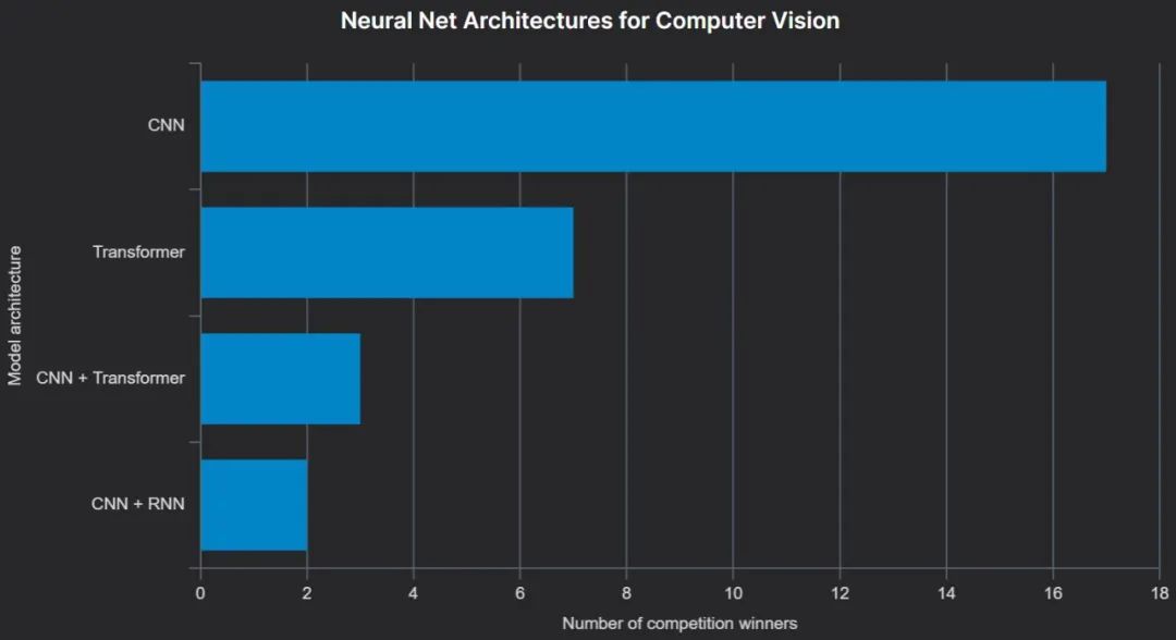 工具有一统江湖的趋势,技术却不是。在 CVPR 2022 上,ConvNext 架构被介绍为「2020 年代的 ConvNet」,并证明其性能优于最近的基于 Transformer 的模型。它被用于至少两个赢得比赛的计算机视觉解决方案,而 CNN 总体上仍是迄今为止计算机视觉竞赛获奖者中最爱用的神经网络架构。