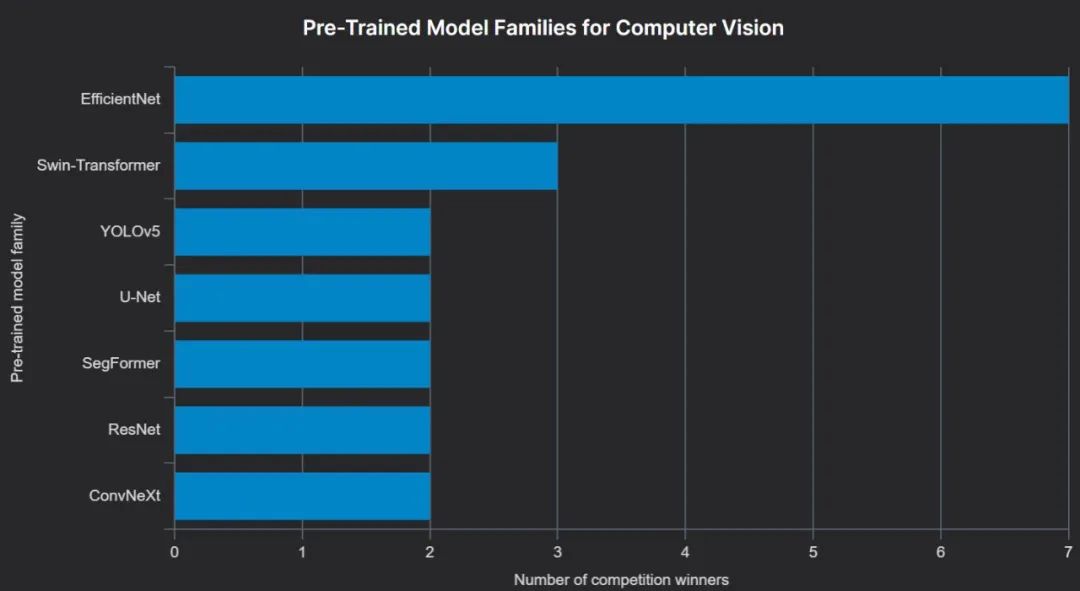 到目前为止,2022 年获奖者中最受欢迎的预训练计算机视觉模型类型是 EfficientNet,顾名思义,它的优势在于比许多其他模型占用资源更少。