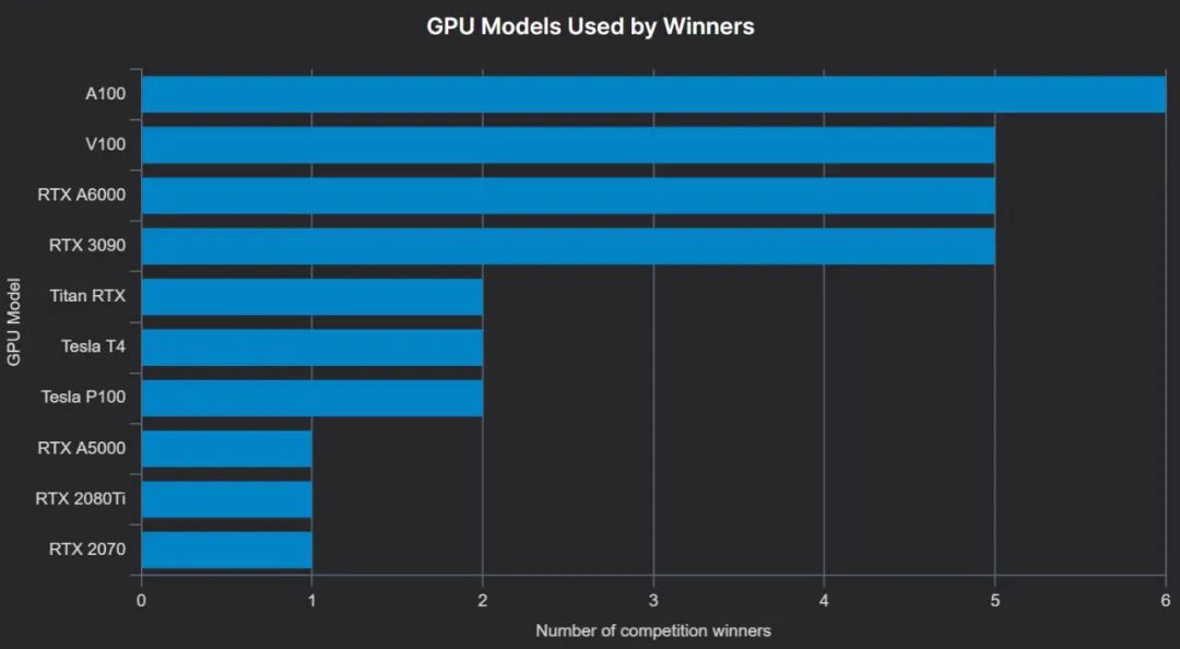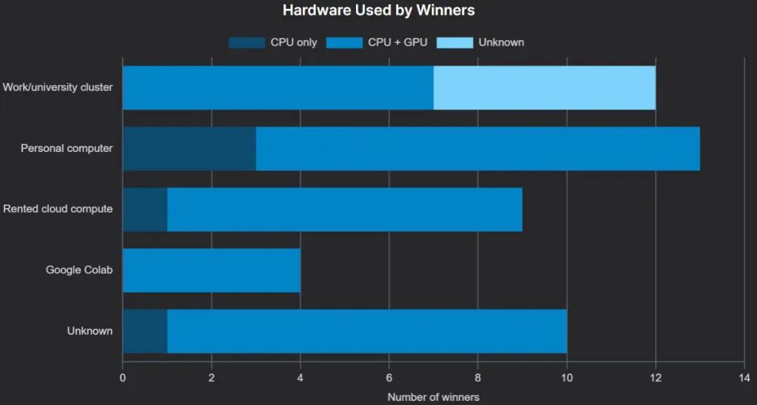 本地个人硬件比云硬件更受欢迎,尽管九名获奖者提到了他们用于训练的 GPU,但没有具体说明他们使用的是本地 GPU 还是云 GPU。