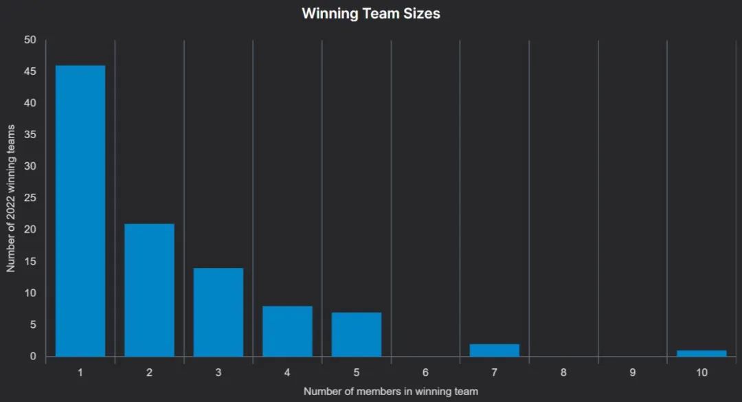 大约有 50%获奖者是一人团队,50%的获奖者是首次得奖。