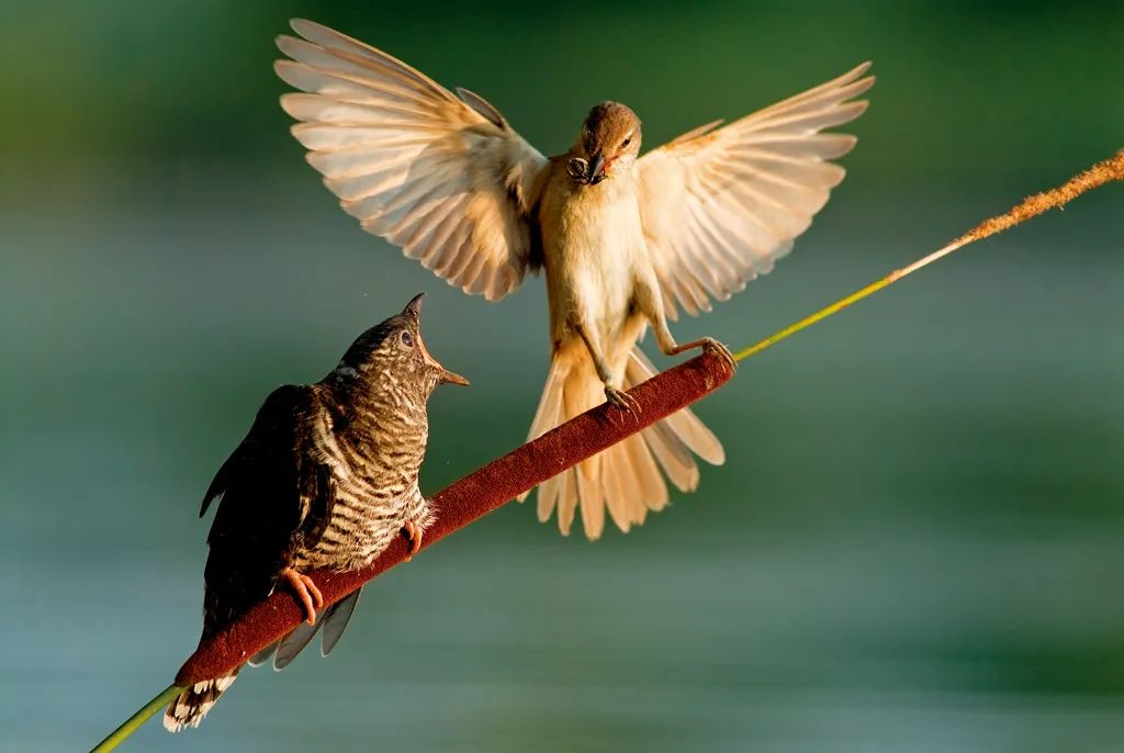一只大苇莺正在喂一只年幼的大杜鹃。尼康D200,300 毫米f/2.8,1/1000 秒,f/4.0,ISO400;单次对焦,捷信三脚架和摄像机云台;匈牙利。本斯·马特 摄