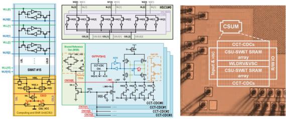 面向Edge端神经网路的加速任务,传统的存内计算设计面临诸多问题和挑战,主要包括短累加致能效下降、阵列利用率低,数据更新成本高和计算-读出访问时间过长等。东南大学团队提出一种用于Edge端神经网络加速的存内计算芯片设计。架构层面,首次提出一种灵活可配置的存算一体阵列,支持两种数据映射方式,在提高阵列利用率的同时可极大降低数据更新成本。该工作以《A 28-nm Horizontal-Weight-Shift and Vertical-Feature-Shift Based Separate-WL 6T-SRAM Computation-in-Memory Unit-Macro for Edge Depthwise Neural-Networks》为题,文章第一作者为东南大学集成电路学院的博士生王博。